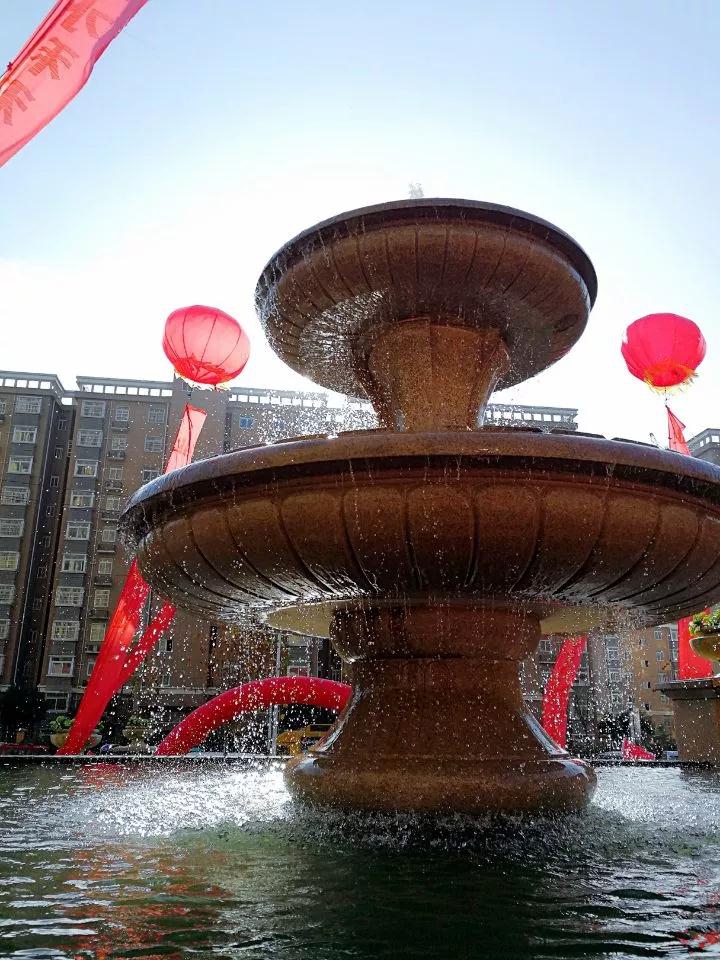 小区正大门的景观喷泉在阳光的映照下,流光溢彩,溅起的水珠如钻石般璀璨耀眼。