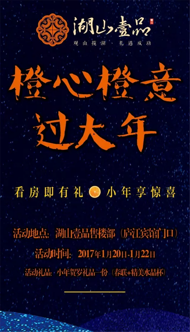橙意如初,诚心依旧。庆贺小年,共享欢乐。凡购买湖山壹品房源的老业主,送您一份橙意礼品:年货大礼包。(年货大礼包:春联+精品坚果+美味糖果+新鲜橙子)。祝愿老业主们新春快乐,阖家幸福!