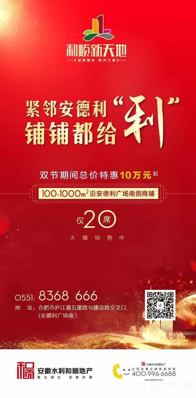 安德利广场的试营业,让投资商铺的亲们看到了繁华怒放的春天,同时也让临大商业圈,地处黄金旺地,坐收安德利商圈红利的和顺新天地锦街凸显在咱庐江人投资或自主经营的商客眼前(钱)。亲们!我想说一句:您已经错过了安德利广场,千万别再错过了我们的和顺新天地锦街!对了,忘了提醒大家,国庆节购商铺有惊喜哦!!!