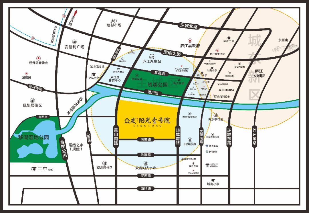 以黄山路与苏家河交汇处为圆心,生活半径两公里范围内,涵盖庐江政、教、文、卫、商在内的几乎所有的相关配套:庐江县政府、住建局,岗湾小学(本项目学区)、城南小学、庐江四中(本项目学区),人民医院、中医院,百货大楼、安德利贸易中心,庐江汽车站,绣溪公园等。城市都芯,繁华之上,动静之间随性转换,无拘无束。