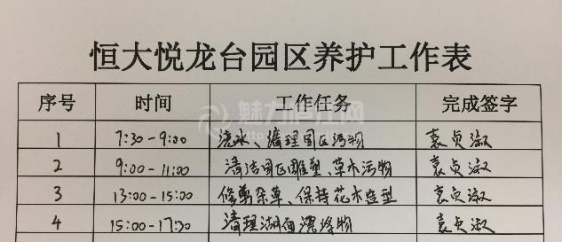 这是袁贞淑在恒大悦龙台(楼盘详情户型图相册地图400-668-6588转6555合肥恒瑞置业有限公司 )每天的工作日程,她对花木有着非一般的感情。如今,她负责恒大悦龙台2.3万方的园林区域,像对待自己的孩子一样,照看每一株花木从来不敢有半点疏忽。